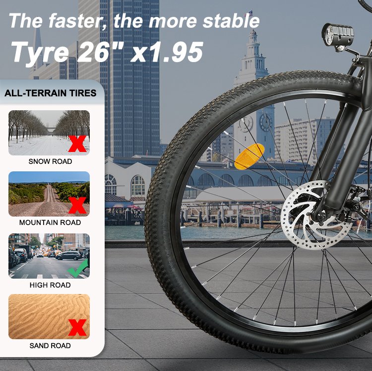 Perfect for commuters and casual riders alike, this 26″ electric mountain bike delivers smooth city cruising with added comfort. Featuring a 350W motor, front suspension, and 26″ × 1.95″ street-optimized tires, it’s ideal for high-road terrain. Lightweight, sleek, and power-efficient — ready for your everyday adventure.