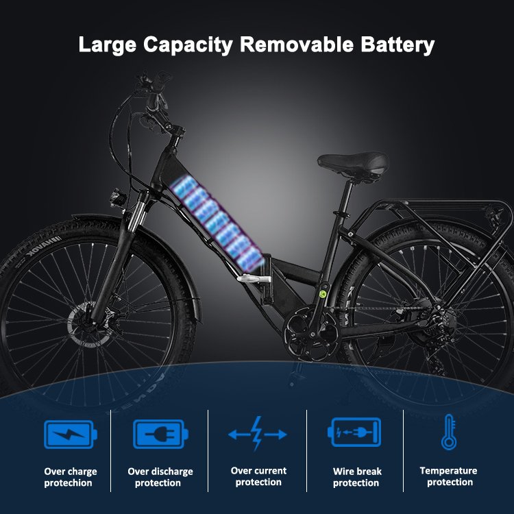 Long-Range 48V 14Ah Battery: Ride up to 40KM per charge with the high-capacity lithium-ion battery, equipped with overcharge, overcurrent, and temperature protection systems. Easily removable for charging convenience.
