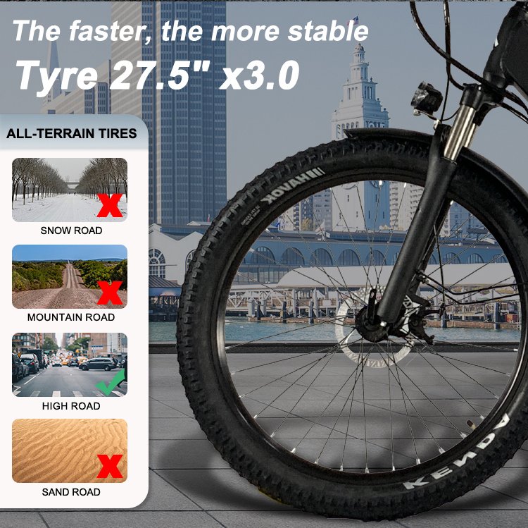 Kenda All-Terrain Tires: 27.5” x 3.0” Kenda Havok tires offer maximum stability and traction across urban streets, mountain paths, and rocky trails.