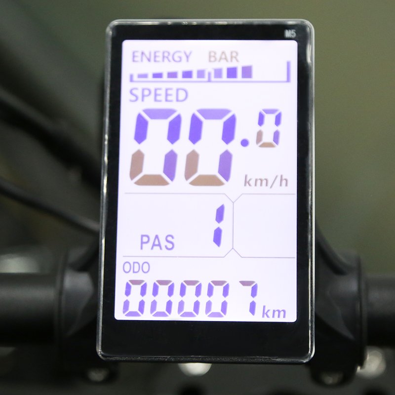 • Back-lit LCD Display (M5) shows speed, battery, trip distance, and assist level.